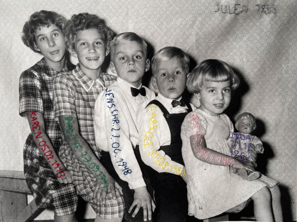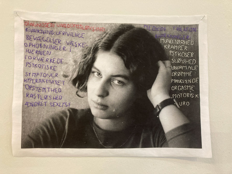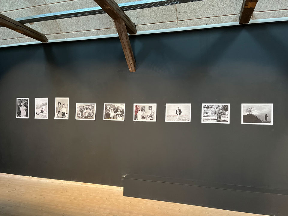 ”Rewrite History” er den første installation. Her har jeg taget udgangspunkt i min mors fotoalbum, som hun lavede til alle os syv søskende. Min mor var både fotograf og aktiv i mørkekammeret, og hendes albums er præget af omsorg og blik for detaljer. Jeg har udvalgt fotos, forstørret dem op på stof og bearbejdet dem, så de nu bærer korte tekster, som jeg har broderet direkte ind i billedfladen. Teksterne udspringer af mine egne erindringer, men de er forvandlede og redigerede, så de både viser og skjuler, både fastholder og omskriver. På den måde bliver billederne en undersøgelse af, hvordan historie og erindring altid er i bevægelse, altid under forhandling.