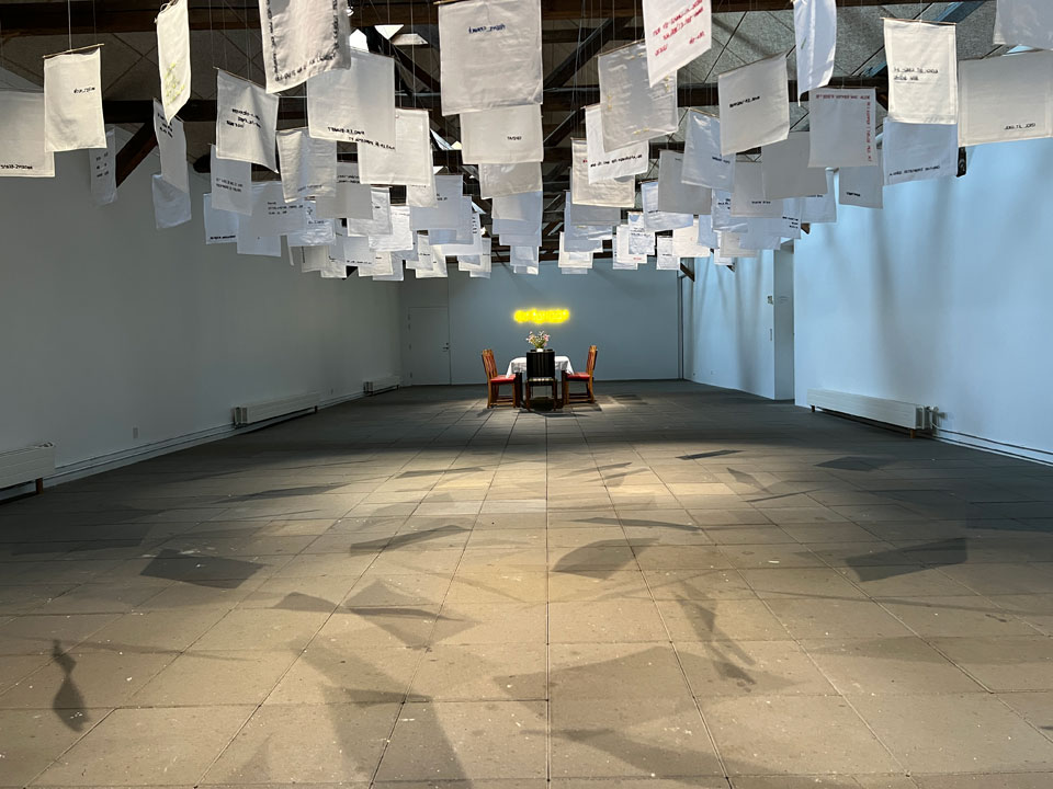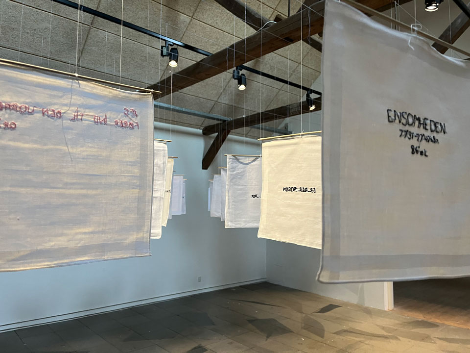 > noter til ensomhed <. Den består af hvide lommetørklæder håndbroderet med ord eller tekster indsat i konteksten: ensomhed. Hængende enkeltvis så de kan bevæge sig.