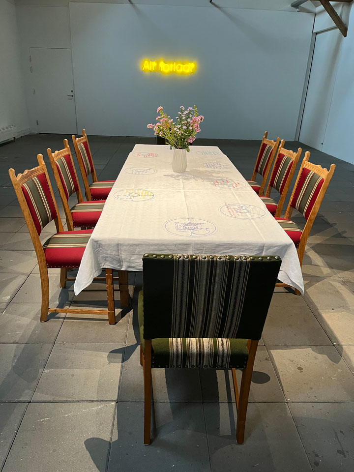 Den tredje installation > Søndagsmiddag <, som tager afsæt i familiens fællesrum: spisebordet. Bordet er dækket op til ni personer, men der er kun otte stole. Fraværet mærkes i blikket og i kroppen. På bordet ligger min mors smukke hørlærredsdug, hvor jeg har broderet ni tallerkner med musselmalede mønstre. Ovenpå mønstrene har jeg broderet episoder fra mit liv. Det er tekster om det, man ikke taler om – alt det usagte, som alligevel sidder mellem mennesker ved et måltid. Ind i mellem høres bordsalmen ”Alle gode gaver”. Denne installation peger både på fællesskabet og på den smertefulde erfaring af udelukkelse, på alt det, der forbliver skjult, selv når vi samles.