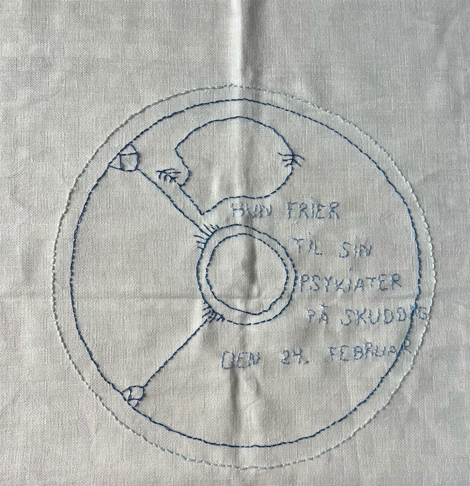 Disse noter er fastholdt gennem processen: håndbroderi på et fysisk, sanseligt materiale: lommetørklæder. At brodere er nærværskrævende og betragtes af de fleste som en total unyttig og tidsforbrugende handling.