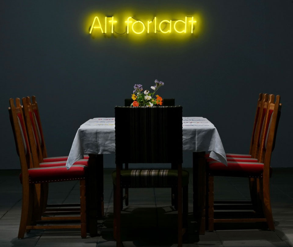 Det fjerde og centrale værk er neoninstallationen > Alt forladt <. Det gule lys fylder den lange bagvæg og fungerer som et ankerpunkt for hele udstillingen. Alle de andre værker forholder sig til dette udsagn, som både kan læses som en personlig erfaring og som en almenmenneskelig sandhed. Neonens lys skaber en både insisterende og skrøbelig tilstedeværelse, som kaster sit skær over de øvrige installationer.