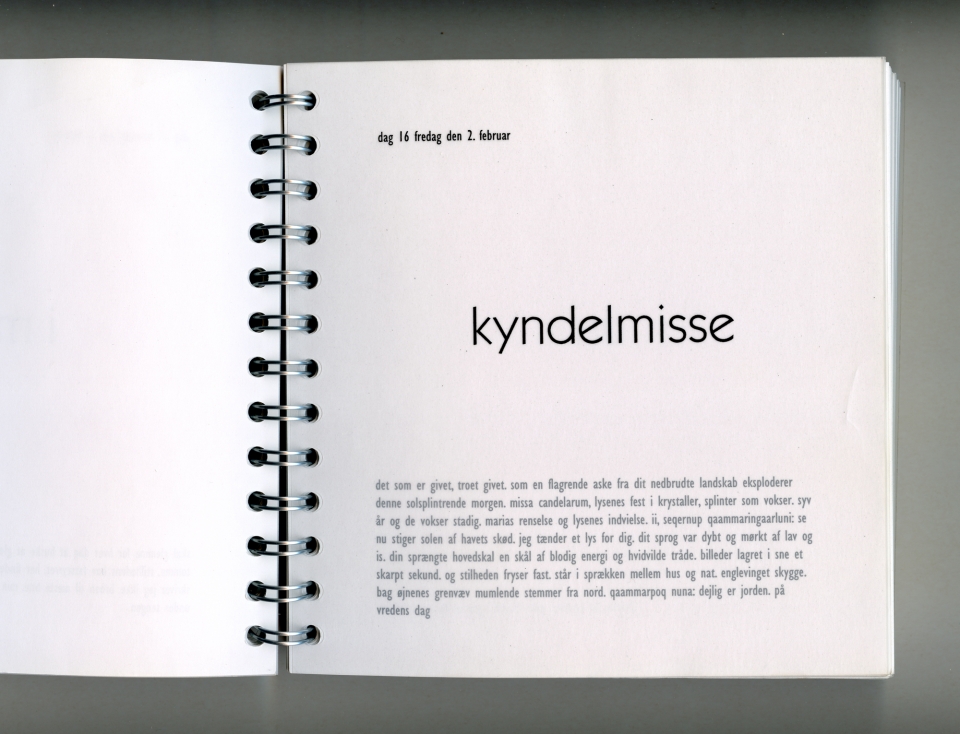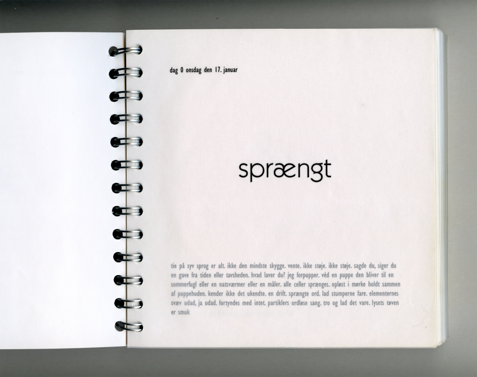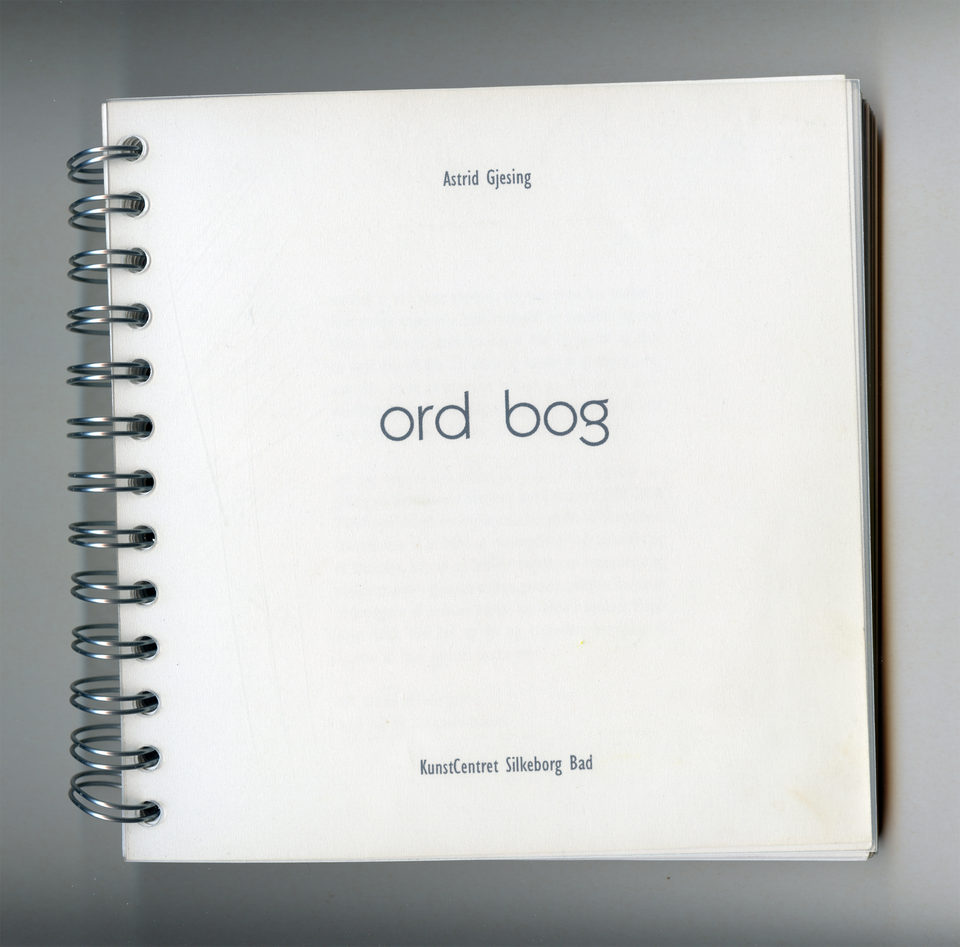 Transparens/transformation - at komme til syne gennem omdannelse. Dette var helt konkret arbejdsgrundlaget for ord bog , som indledte mit arbejde med denne udstilling. ord bog er et visuelt bogværk, der som tema har puppen i dens mange aspekter - zoologisk og metaforisk. Værket er skabt fra dag 0 den 17. januar og slutter med dag 59 den 17. marts og består af et dagens ord, som dels er et selvstændigt udsagn og dels er et mønster/filter brugt til afsøgning af dagen. På den måde er hver dags tekst opstået af denne udforskning. Denne dobbelthed fremtræder også visuelt, hvor dagens ord står på transparente sider, der ligger "ovenpå" teksten, der er trykt på almindelig papir. ord bog blev i marts 2002 publiceret af KunstCentret Silkeborg Bad som prolog til udstillingen, og den fungerer som en form for drejebog for udviklingen af lyrikinstallationen. Det der gradvist er kommet til syne under mit arbejde med denne installation er mange forskellige slags alfabeter. At anskue ideerne under denne titel, viste sig at være meget frugtbart.