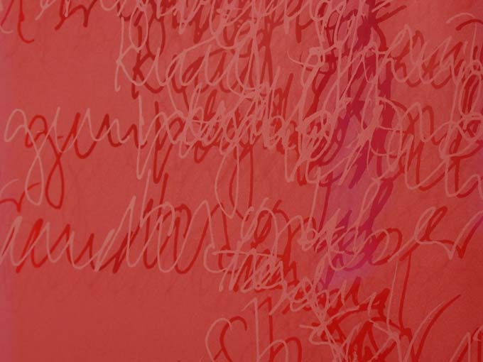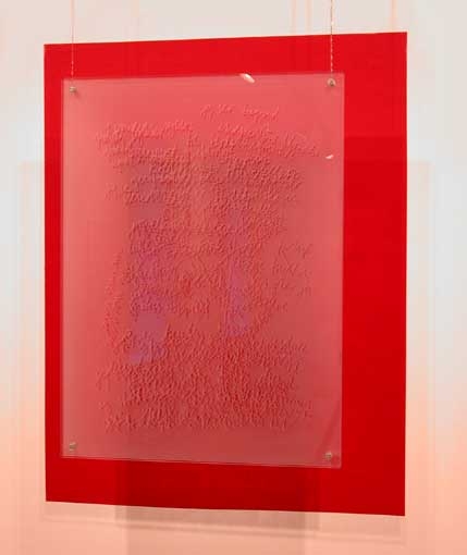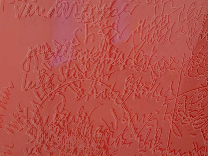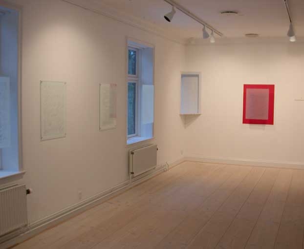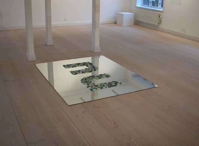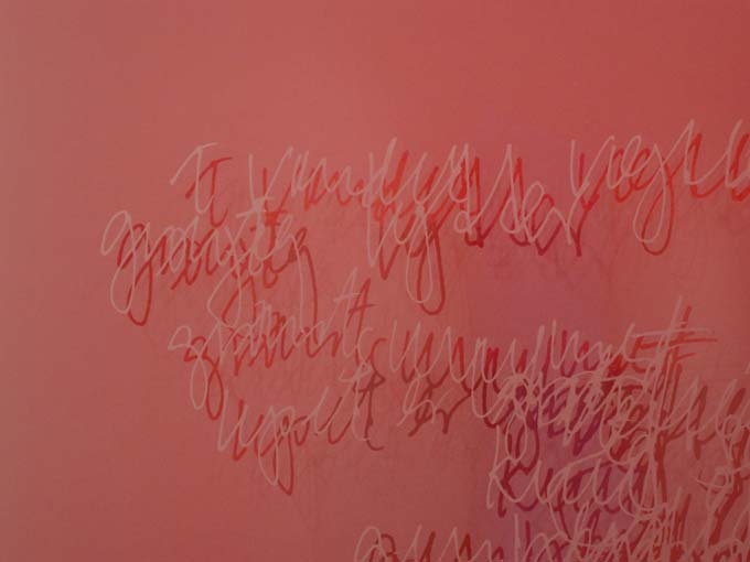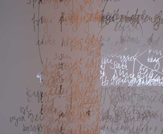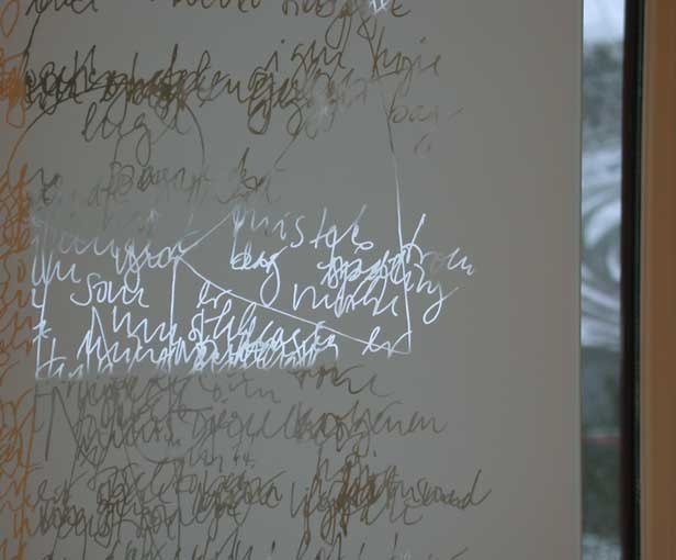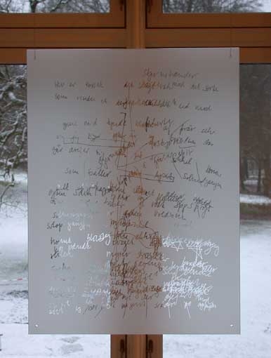 Ophængt på væggene og foran vinduesglassene er "blindskrift" sandblæst i glas. Det er en form for automat-digt-skrivning med lukkede øjne. Disse håndskrevne tekster er sandblæste på glas positiv/negativ (positiv er skriften sandblæst, negativ er baggrunden sandblæst). De positive hænger 1 cm fra væggen og belyses så skriften forsvinder, og det der kan læses er skyggen af skriften på væggen. De negative hænger foran vinduesglassene og er læsbare gennem den natur og det lys, der kommer ind gennem den klare skrift. På en spejlflade på gulvet er den positive form af nu skrevet med sand- og vandslebne glasstykker fundet på stranden. Installationen opererer i det skrøbelige og flygtige spændingsfelt mellem skrift, glas, lys og lyd.
