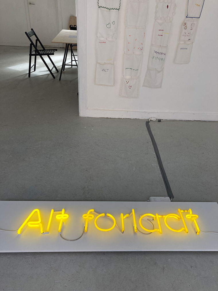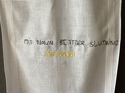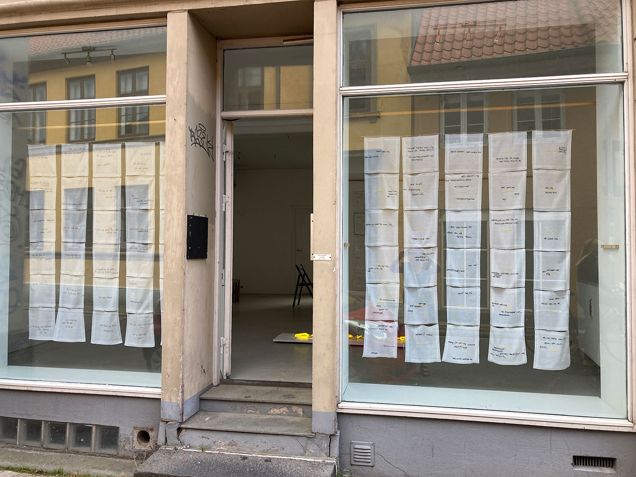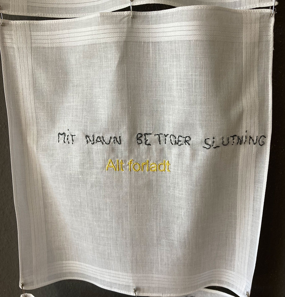 Disse lommetørklæder er nu samlet til et væv, der hænger for vinduerne i rum46 og gennem dem kan man se neonværket ”Alt forladt” i lysende gult ligge på gulvet.