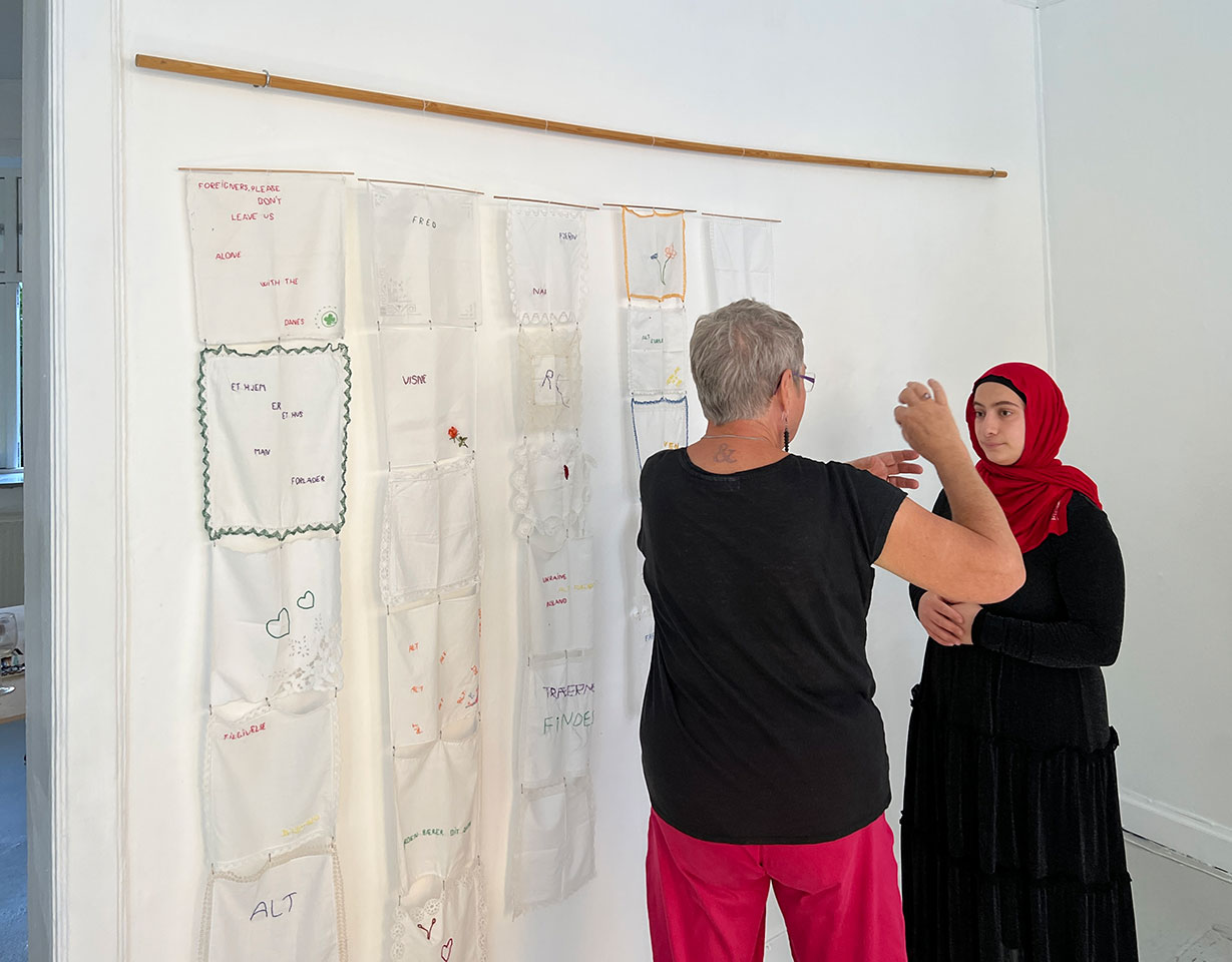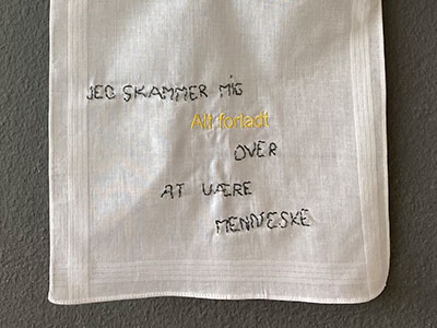 Under udstillingen i rum46 inviteres gæsterne til at skabe deres egne tolkninger af udsagnet med nål og tråd på gammeldags lommetørklæder i stof, som de kan skabe tekster og symboler på. Med denne invitation til samskabelse ønsker Gjesing at åbne kunsten for gæsterne og give dem mulighed for at udtrykke de følelser og tanker, som installationen sætter i gang hos dem. Disse syede bidrag blev løbende hængt op.
