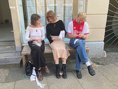 Den anden del af værket var, at Astrid Gjesing ringede på samtlige 96 lejligheder i de to blokke og inviterede beboerne til at deltage. Spurgte om de ville fortælle om noget fra deres liv eller vigtige begivenheder, som de gennem årene havde oplevet i bebyggelsen. Disse fortællingerne bearbejdede Astrid Gjesing, og de vigtigste udsagn blev af hende håndsyet på hvide damelommetørklæder, hvor der med gul skrift var maskinbroderet Alt forladt.