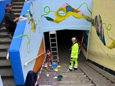 > er på vej< udsmykning af cykel – og gangtunnel ved Læssøes Gades Skole, sammen med Street artists Mie Jacobsen, Andrea Momme og Christoffer Bukh. For Aarhus kommune. 2022