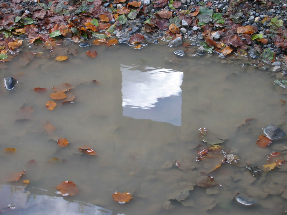 det er fra Irland, hvor jeg opdagede denne himmelspejling, og da jeg skulle til at fotografere den, gik der en sky for solen, eller der kom et vindkast, så der gik det meste af en formiddag før sol og vind passede sammen. Vi var i Irland, fordi han skulle lave en udsmykning, og jeg var igen med. Det er evigheder siden. Jeg tror, det var i september måned, og jeg vidste som sædvanlig ikke, hvad jeg skulle lave der, og sådan var det vel hver gang, jeg var med ham på hans kunstprojekter