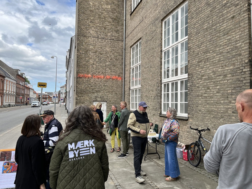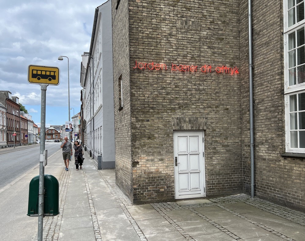 Da jeg fik opgaven om at skabe ”Jorden bærer dit aftryk” til Horsens, gik jeg i gang med at udforske byen, som jeg ikke kendte. Jeg gik på kryds og tværs til fods og oplevede en by med megen kunst i byrummet. Og det jeg blev mest optaget af, var byens berømte byssøn Vitus Bering. Han viste sig at have været dansk søofficer i den russiske hær og sidenhen opdagelsesrejsende på de to Kamtjatka-ekspeditioner, der bl.a. påviste, at Sibirien og Nordamerika ikke er forbundne, men er delt af et stræde. Det blev navngivet Beringstrædet efter polarforskeren, der krydsede strædet i 1728. Først opdagede jeg Vitus Berings Plads, men da jeg opdagede Kamtjatka 13, Student House, synes jeg at det var det oplagte sted – et kollegium for internationale studerende ville være med til at udvide oplevelsen af min udsmykning.
