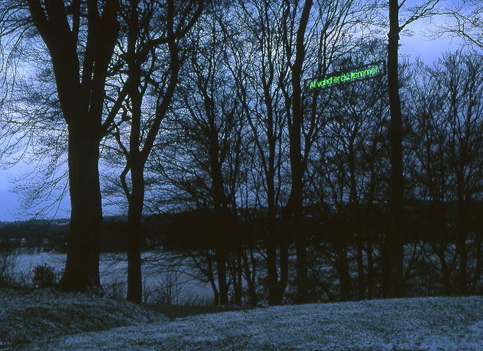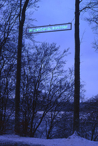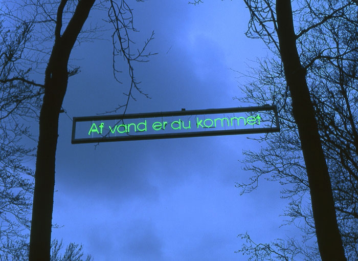Af vand er du kommet , grøn neon ophænges meget højt - 10 meter - oppe udspændt mellem to bøgestammer, der står på toppen af skrænten ovenfor kilden. Digtet hænger så det læses oppe fra plænen med himlen som baggrund. Neonlyset kan ses og lokke fra indgangsområdet til KunstCentret.