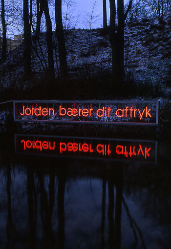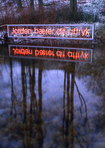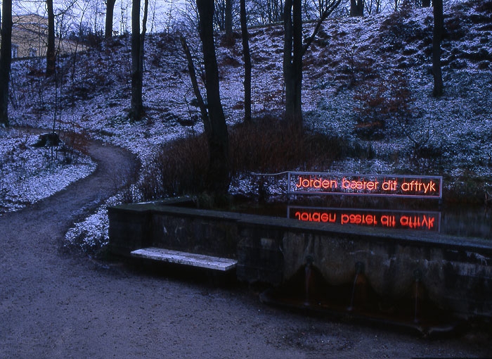 Jorden bærer dit aftryk , rød neon sættes på to tynde metalben ned i bunden i den venstre side af kildesøen helt tæt inde ved irisplanterne. Digtet skal læses nede fra kildepladsen med front mod kilden, og samtidigt ses Af vand er du kommet hængende meget højt oppe over toppen af skrænten.