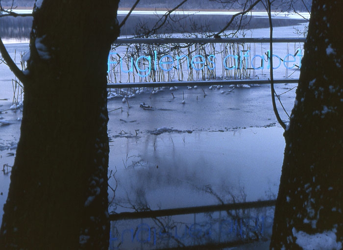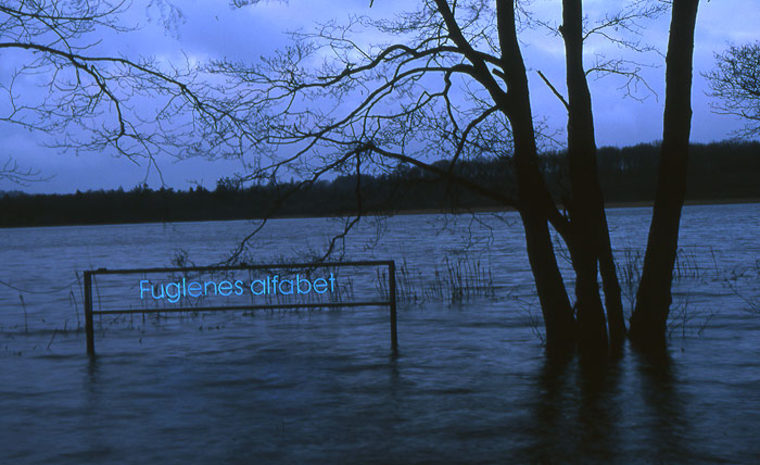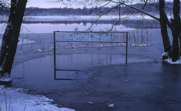 Fuglenes alfabet , blå neon sættes på to tynde metalben ned i søbunden til højre for det sted, hvor kilden løber ud i Ørnsø, der hvor der er åbent vand med tagrør 4 meter ude i søen, således at digtet læses med front mod søen og med tagrørene som baggrund.