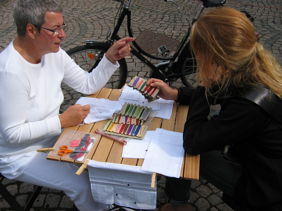 I 2007 startede jeg med at indsamle og brodere udsagn om ensomhed. Jeg skulle lave en soloudstilling på Kvindemuseet, og jeg satte mig med mit sybord og en tom stol og på min ryg stod der > noter til ensomhed < ude i byrummet. Min forestilling og håb var, at folk ville sætte sig ned og samtale om ensomhed. Og det gjorde de. Satte sig og talte, mange skyndte sig at sige, at de ikke selv var ensomme, og alligevel gik der sjældent længe, før de fortalte om deres egen ensomhed. Jeg lyttede og spurgte og endte med at finde et udsagn, som jeg så broderede på lommetørklæder.